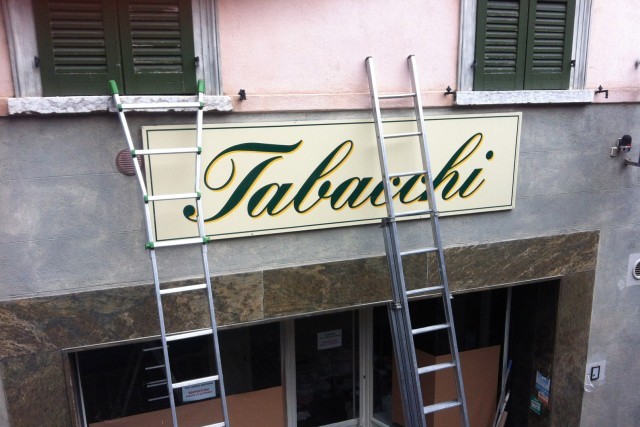 Sono insegne con fondo in alluminio, vengono intagliate con lettere o sagome, di notte quando accese s'illuminerà solo logo e scritte.